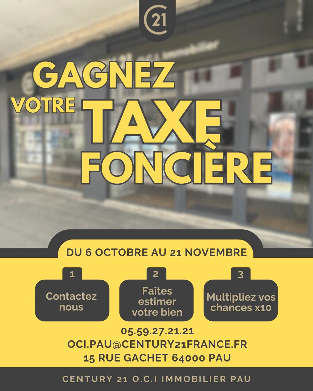L’agence Century 21 OCI Immobilier à Pau est ravie d’annoncer le lancement de son opération tactique “Gagnez votre taxe foncière”. Cette initiative unique vise à offrir aux propriétaires la possibilité de réduire leur charge fiscale tout en bénéficiant d’une estimation gratuite de leur bien immobilier et de la mise en place d’un panneau “C A vendre” ou "J'aime ma ville" sur leur maison ou appartement.